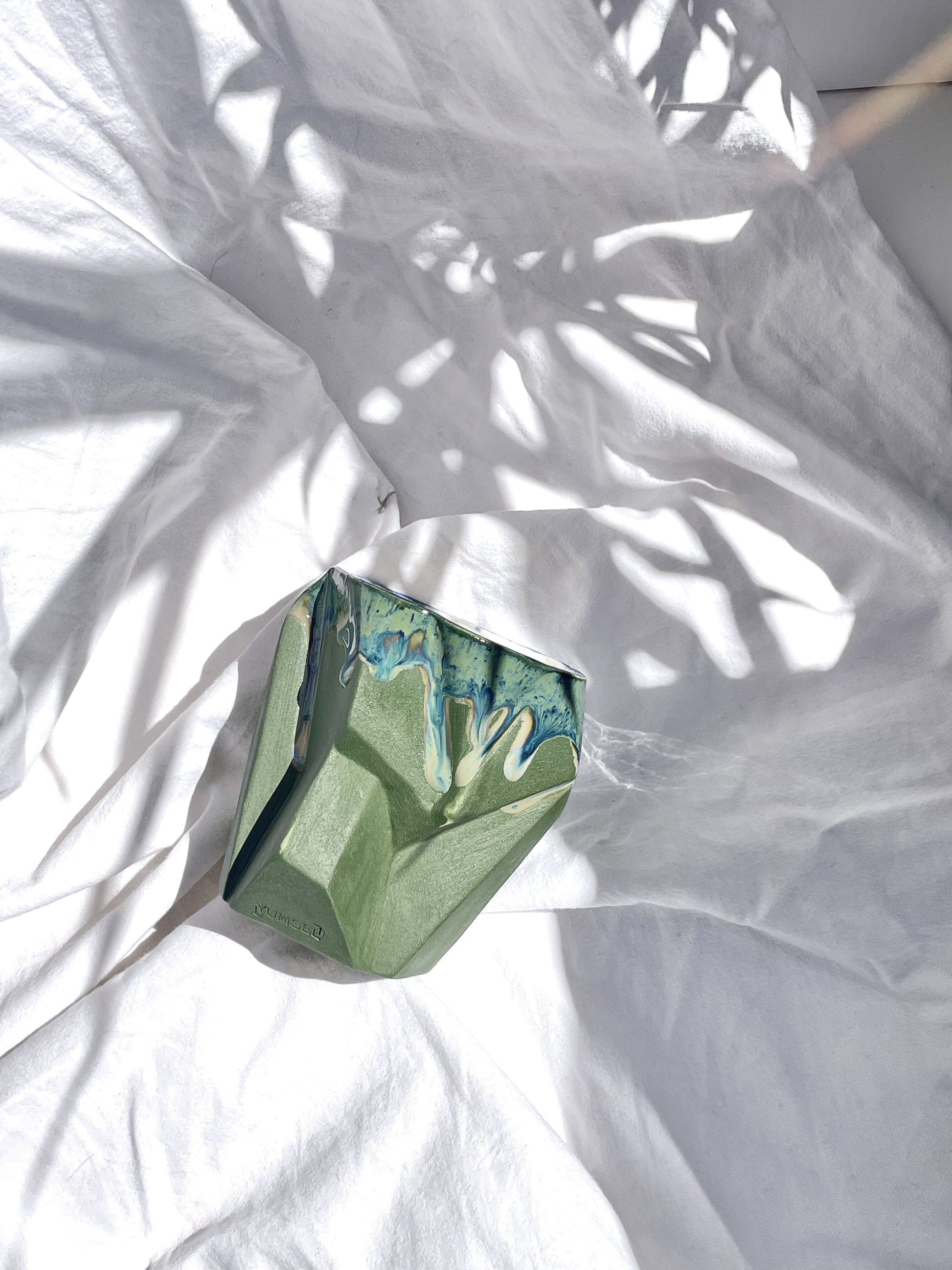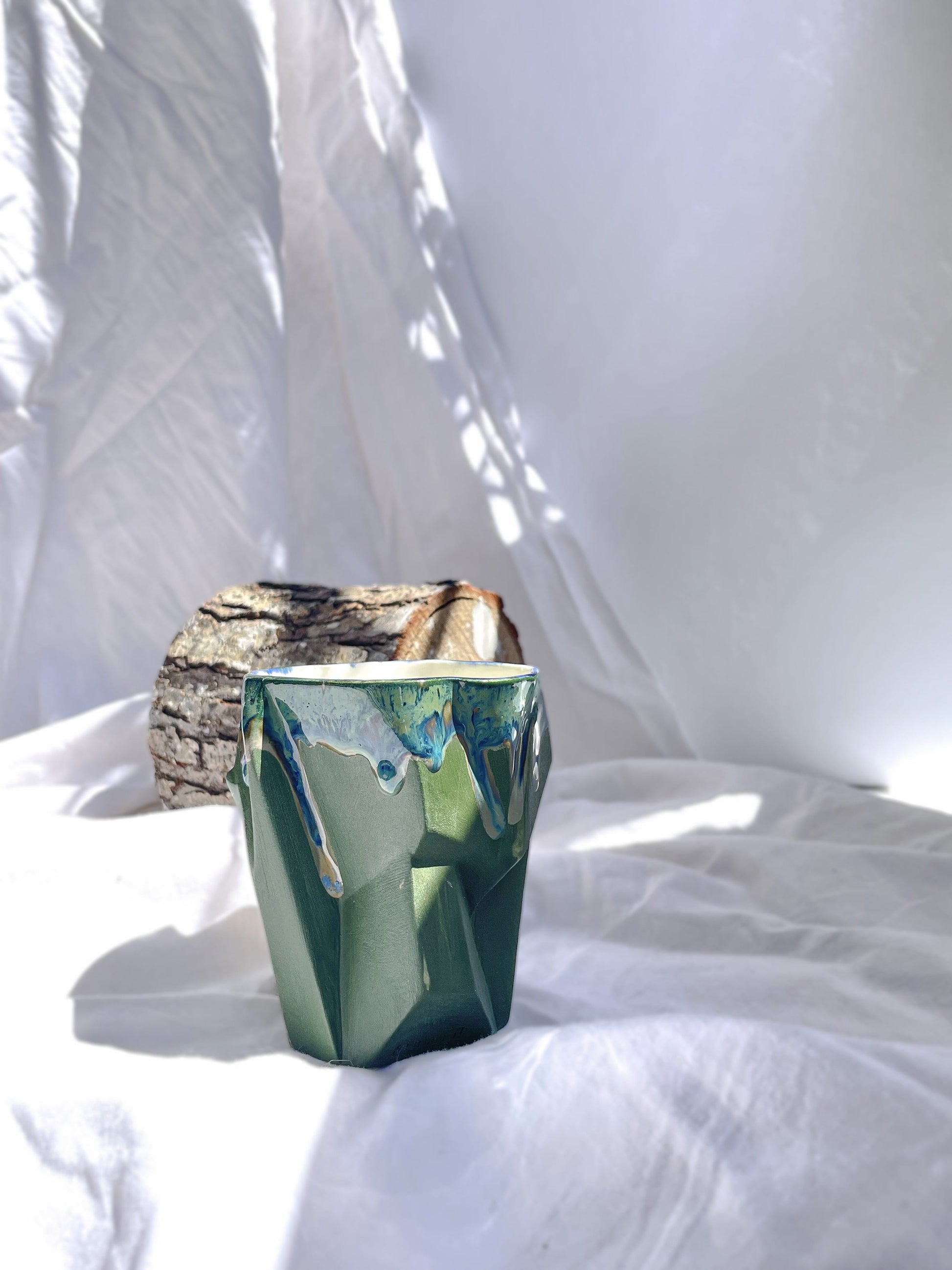De "Mas" beker is een speciaal ontwerp dat de gesculpteerde elegantie van de natuur weerspiegelt. Versierd met natuurlijke tinten van groen en blauw, is deze beker net zo uniek en ongeëvenaard als de natuur zelf. Gemaakt van een speciale mix van keramiek, porselein en aardewerk, is de "Mas" beker met zorg gedetailleerd en gecreëerd als een uniek stuk in de wereld.
